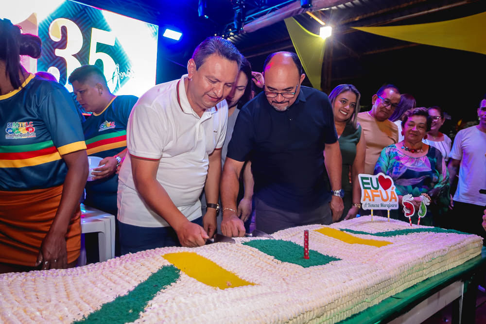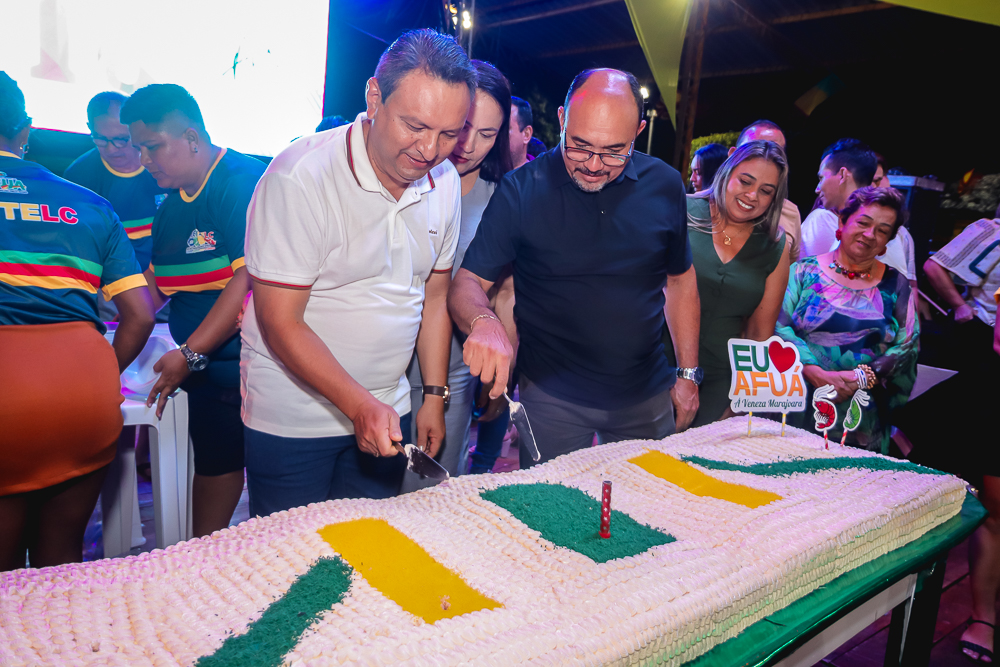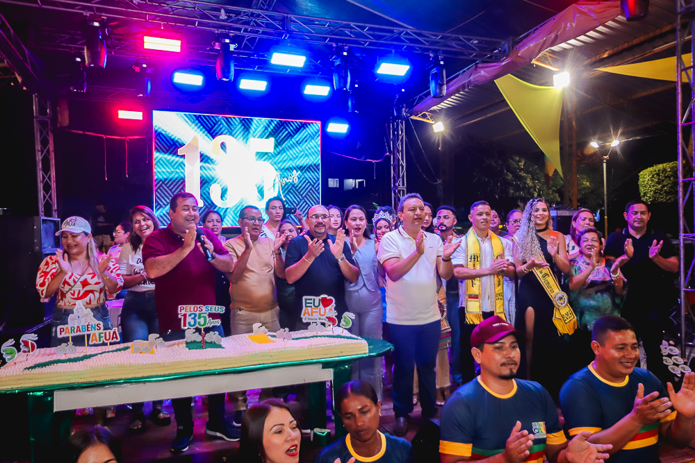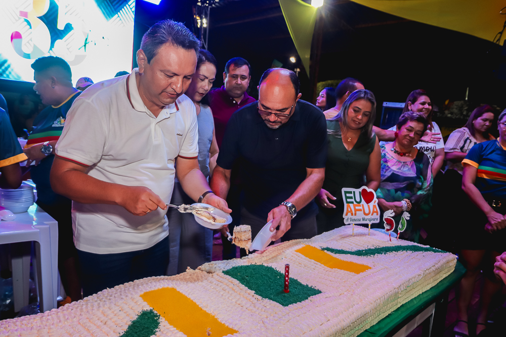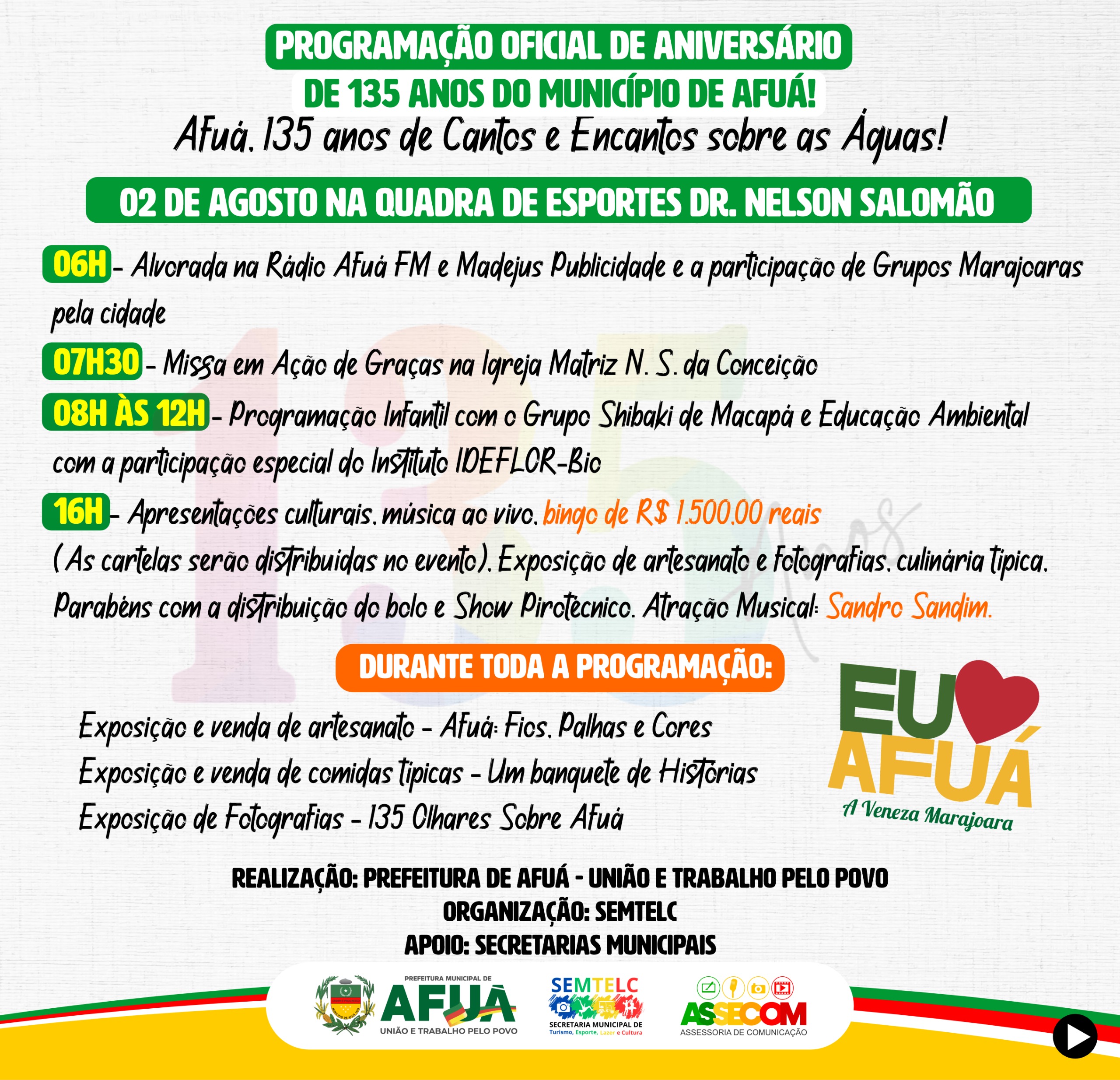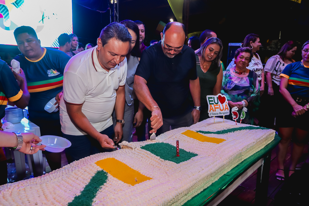Às 16h teve início a programação na Quadra de Esportes Dr. Nelson Salomão com apresentações culturais, música ao vivo, bingos, exposições de artesanato e fotografias históricas de Afuá, venda de comidas típicas e a hora dos Parabéns com a presença do Exmo. Prefeito Sandro Cunha, Vice-Prefeito Nilton Paes, vereadores e secretários municipais e distribuição de bolo para os presentes. E para fechar a programação com chave de ouro, show com o cantor afuaense Sandro Sandim.